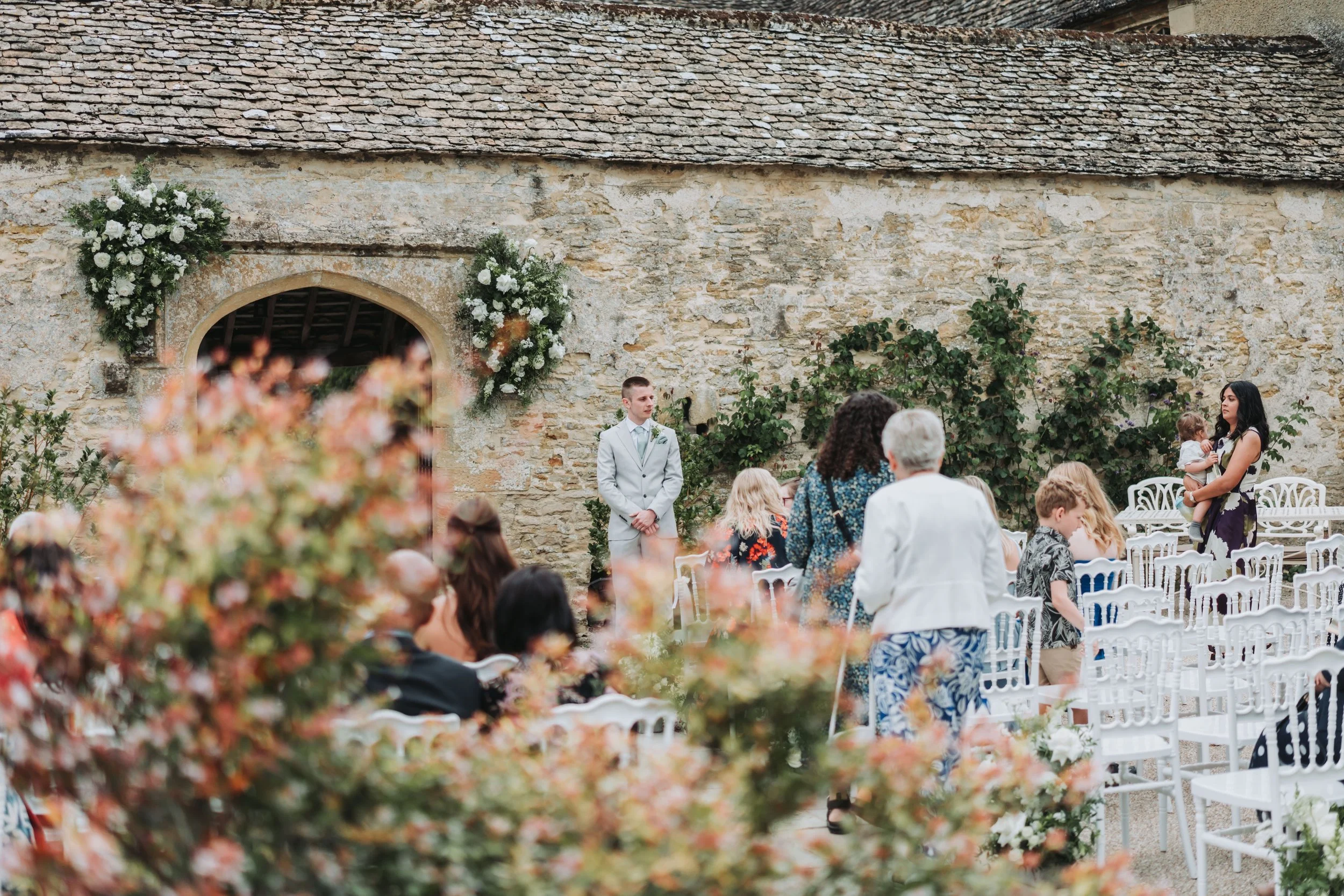 Then it was ceremony time. Guests took their seats, Luke waited patiently at the front, and the music began. My lens was focused straight down the aisle, ready to capture the bridesmaids as they made their entrance. Moments later, Hannah appeared with her dad, and I stepped ahead to capture intimate, close-up shots of their walk through the courtyard before running back to photograph Luke’s first look. That priceless tear in his eye said everything.
